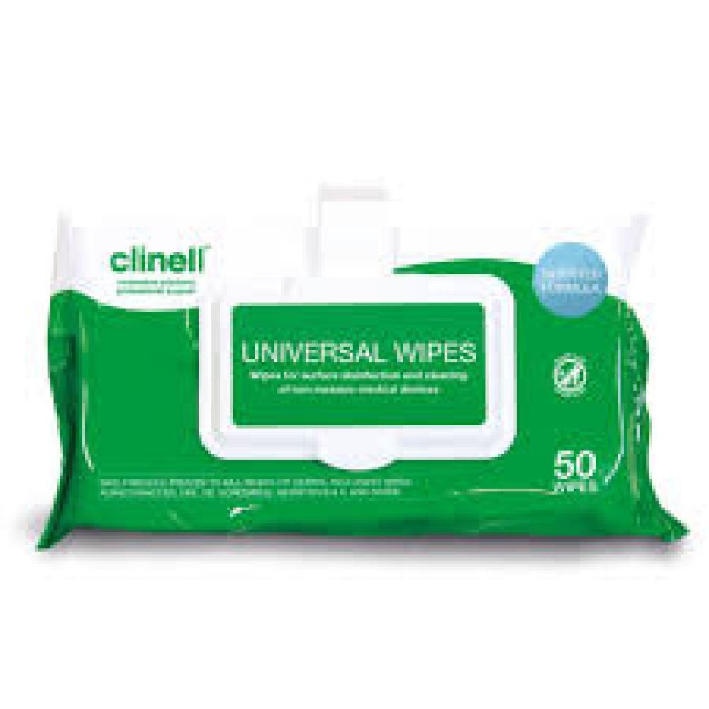 Clinell Universal Sanitising Wipes with Clip – Packet 50
